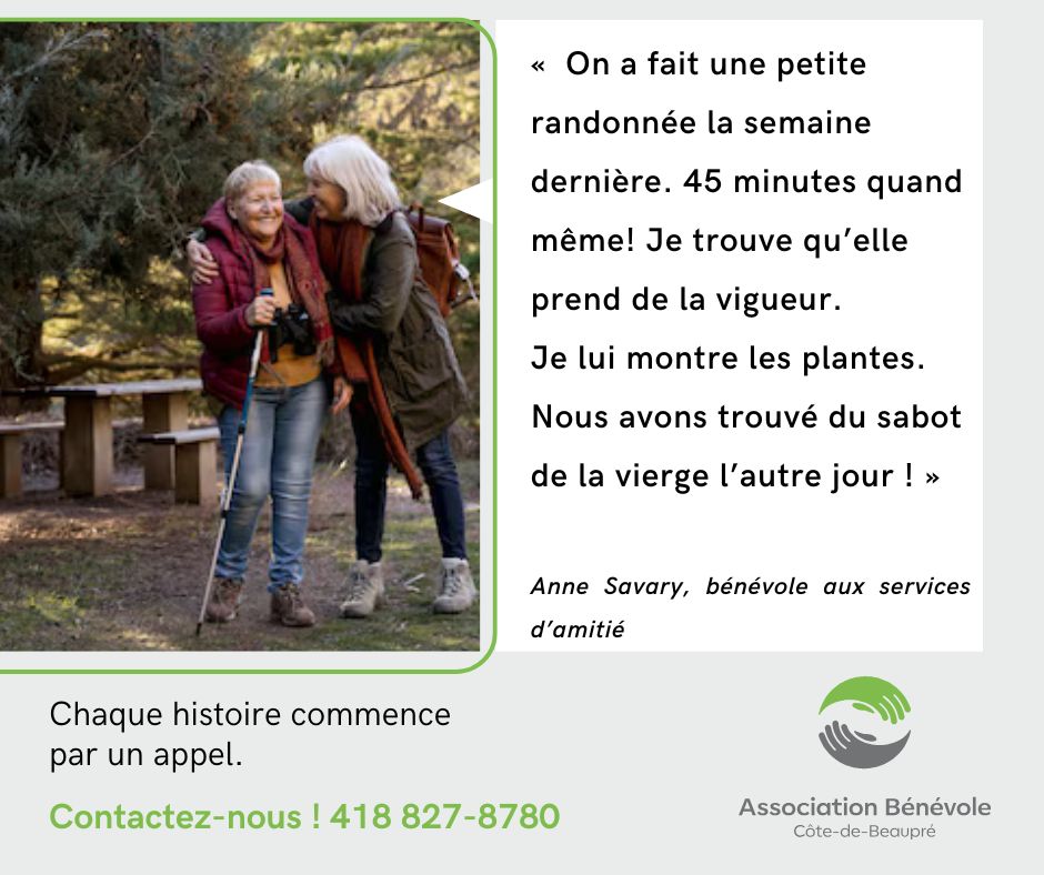 - Visites d'amitiés: Des bénévoles rendent visite régulièrement à la personne pour échanger et passer du temps de qualité (sortie, marche ou autre).